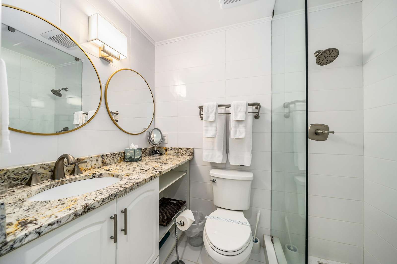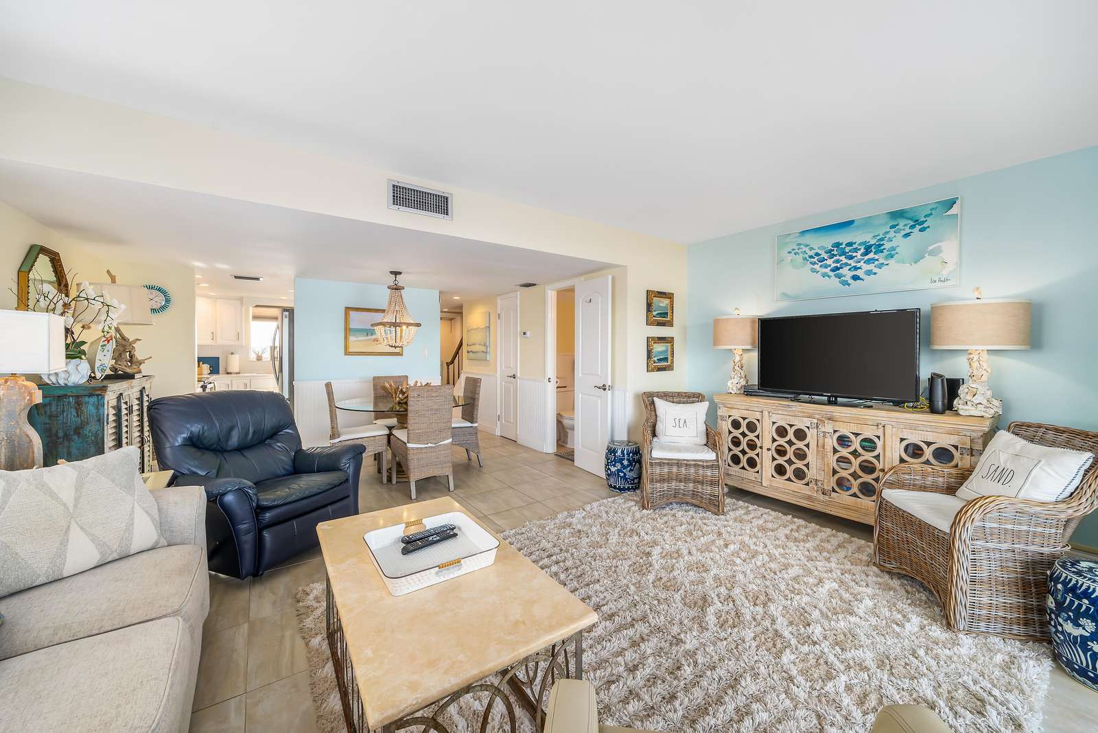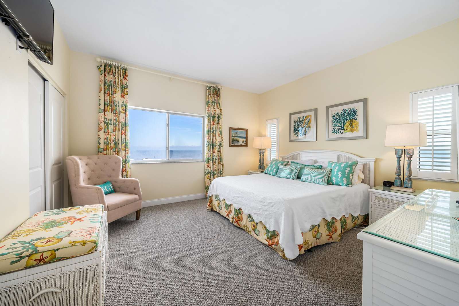 2 bedrooms with 2 1/2 baths. Master bedroom has king bed. Second bedroom includes two queen beds. Bedrooms and two baths upstairs, kitchen, dining, living area, and 1/2 bath downstairs. Combined living room and dining area with full kitchen. Corner-wrapped patio allows you to view the ocean from two sides, and second-floor location gives a great view of the beach and pool. Relax in the large pool or on the beach; it's all right here!