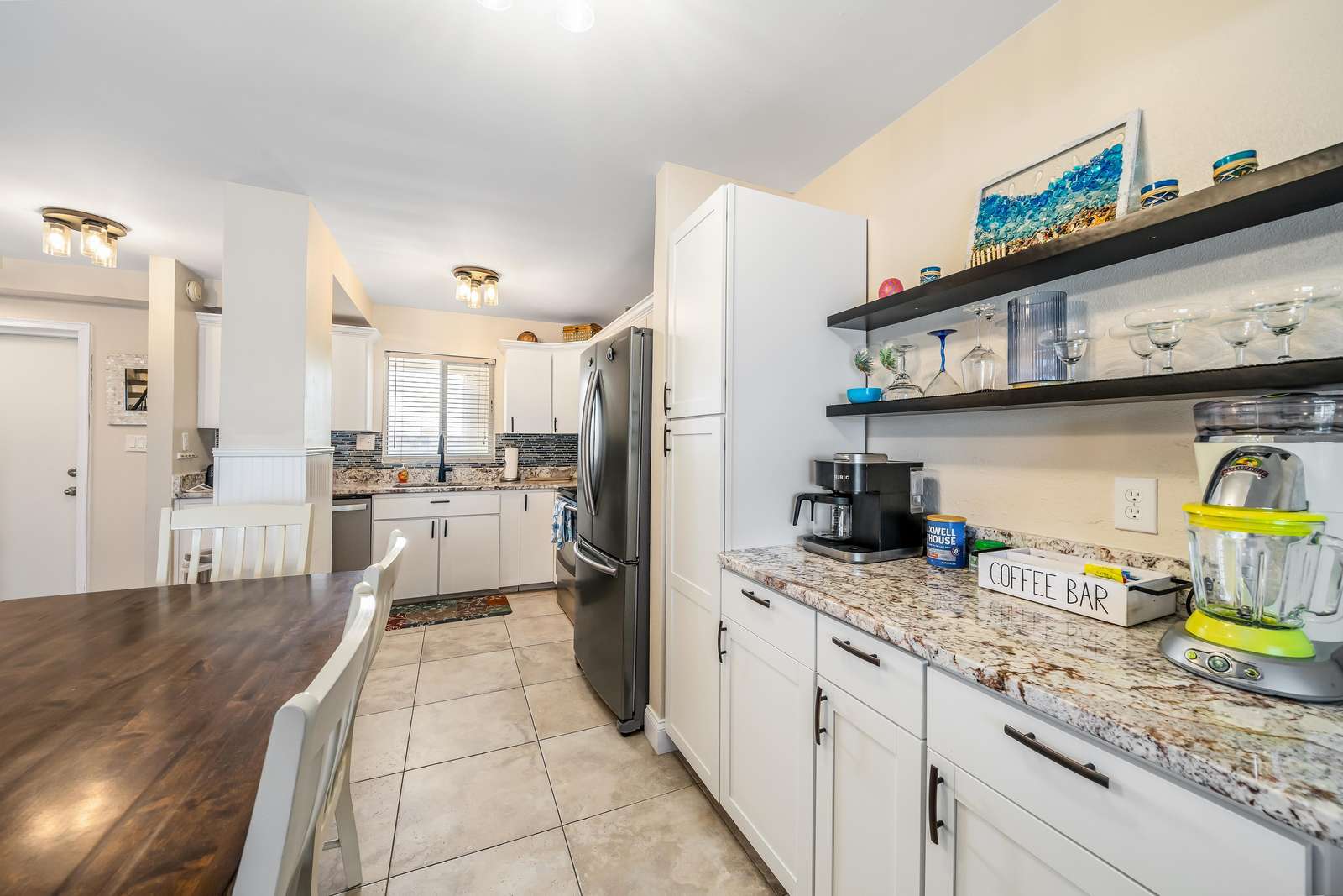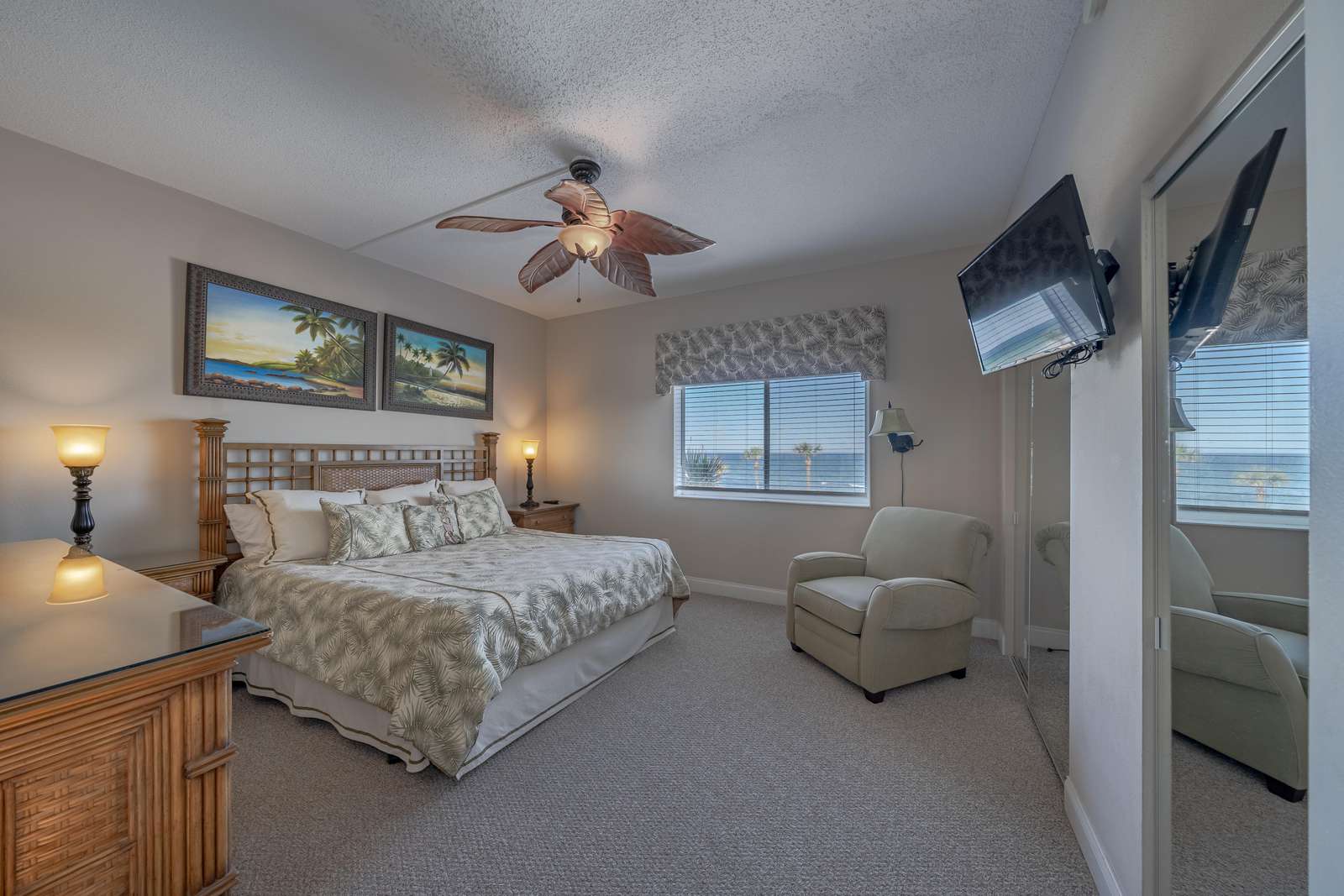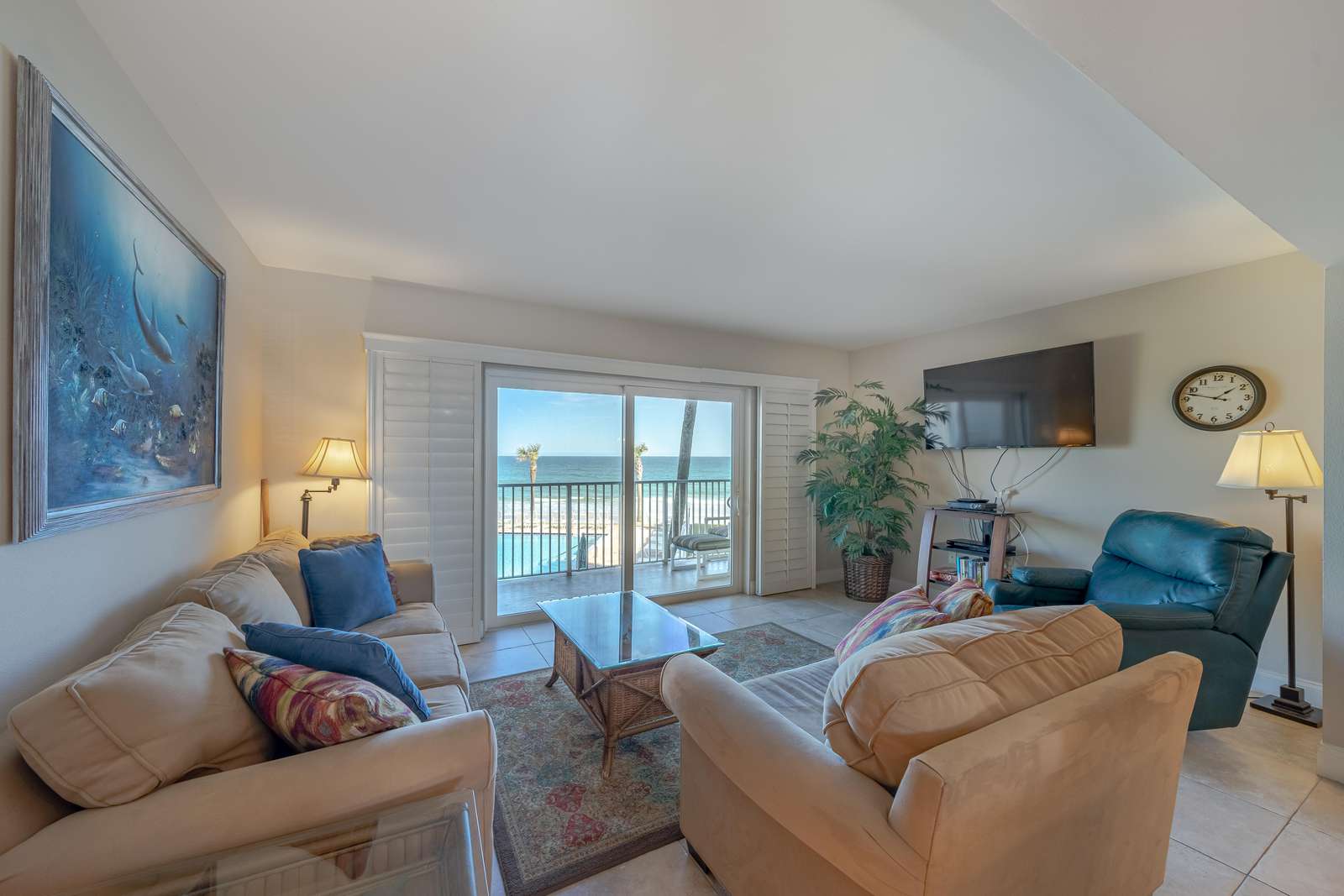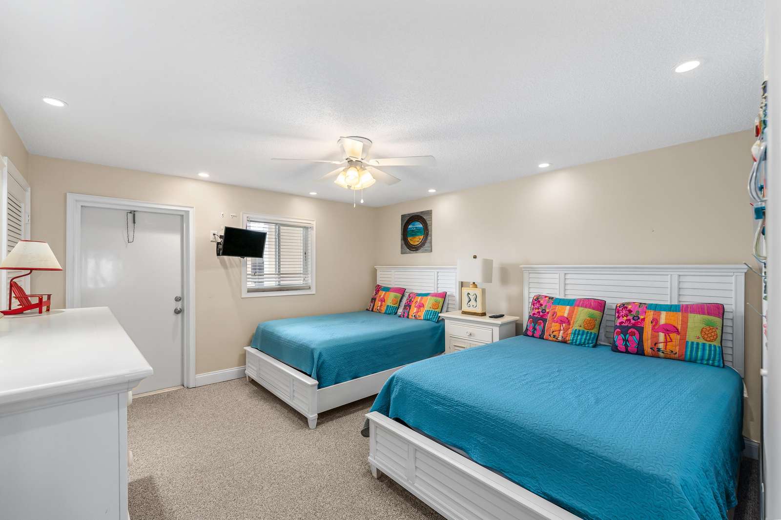 2 bedrooms with 2 1/2 baths. Master bedroom has king bed. Second bedroom includes two queen beds. Bedrooms and two baths upstairs, kitchen, dining, living area, and 1/2 bath downstairs. Combined living room and dining area with full kitchen. Patio allows great view of the ocean, and second-floor location gives a wonderful view of the beach and pool. Relax in the large pool or on the beach; it's all right here!