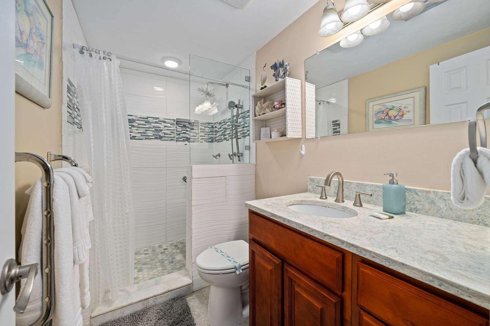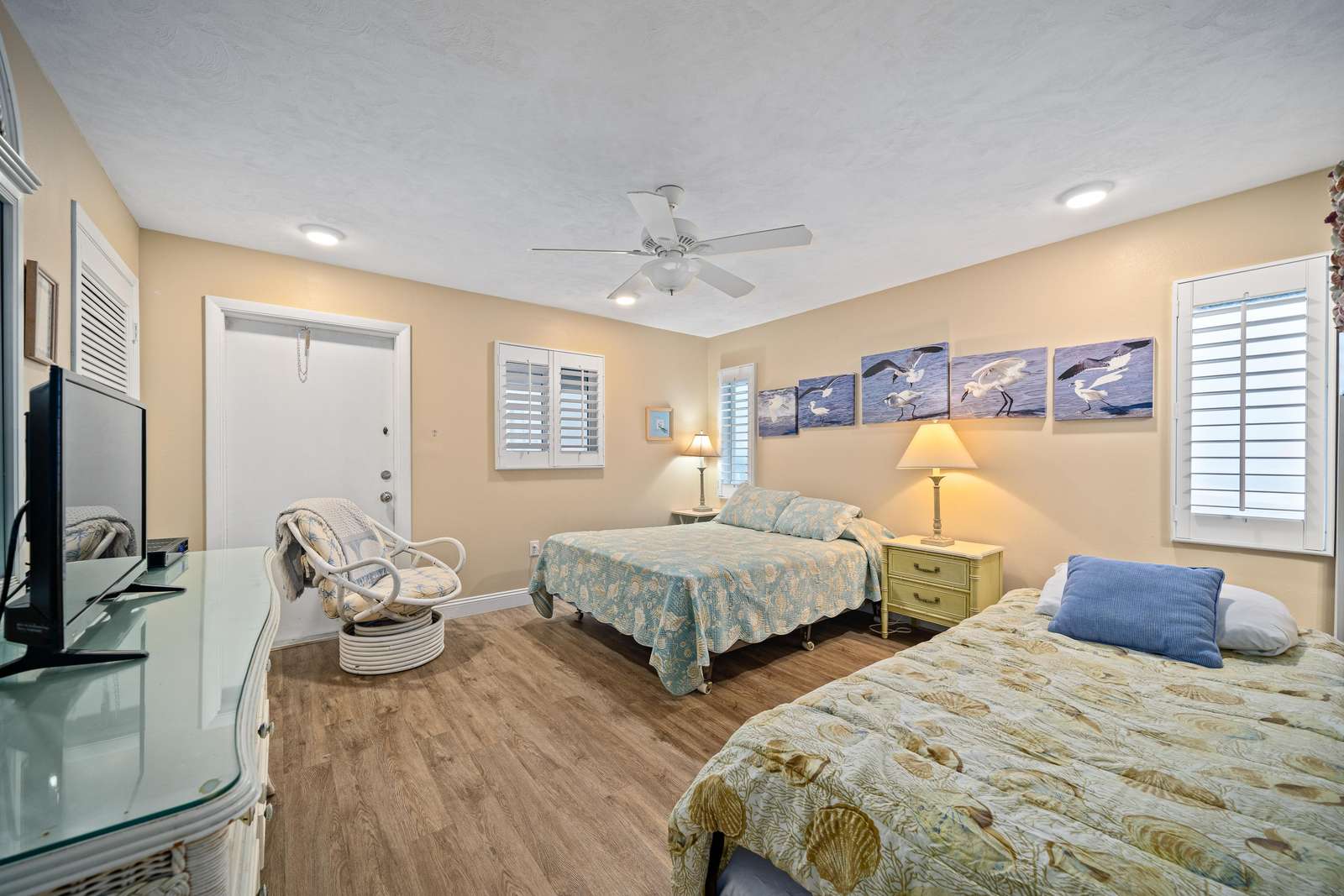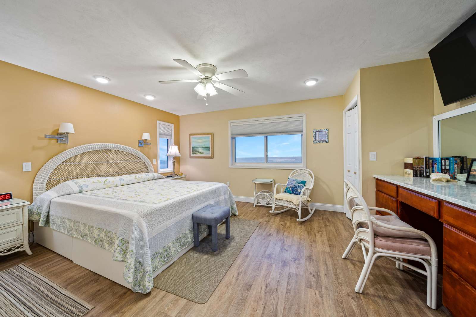 Corner unit allows great views up the beach and directly out to the ocean. 2 bedrooms with 2 1/2 baths. Master bedroom has king bed. Second bedroom includes two queen beds. Bedrooms and two baths upstairs, kitchen, dining, living area, and 1/2 bath downstairs. Combined living room and dining area with full kitchen. Deck allows great view of the ocean, and second-floor location gives a wonderful view of the beach and pool. Relax in the large pool or on the beach; it's all right here!