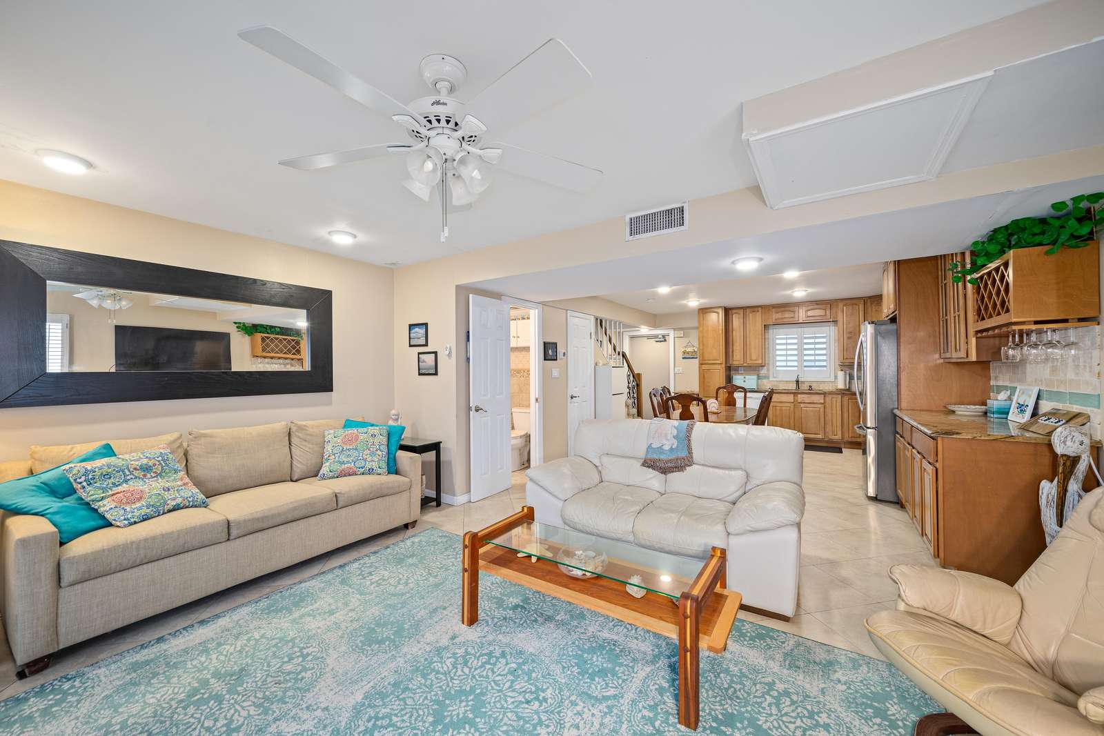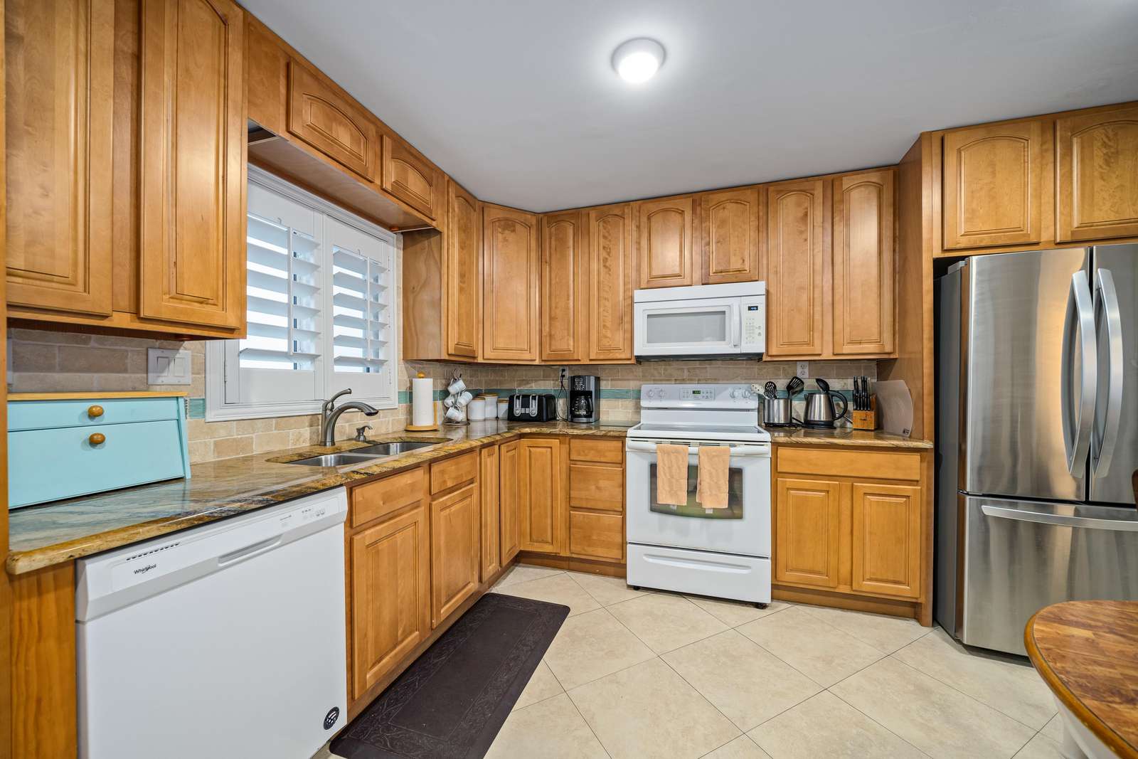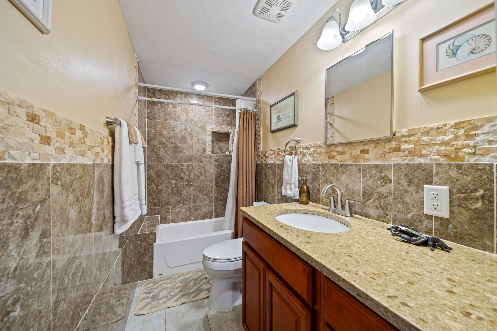 Corner unit allows great views up the beach and directly out to the ocean. 2 bedrooms with 2 1/2 baths. Master bedroom has king bed. Second bedroom includes two queen beds. Bedrooms and two baths upstairs, kitchen, dining, living area, and 1/2 bath downstairs. Combined living room and dining area with full kitchen. Deck allows great view of the ocean, and second-floor location gives a wonderful view of the beach and pool. Relax in the large pool or on the beach; it's all right here!